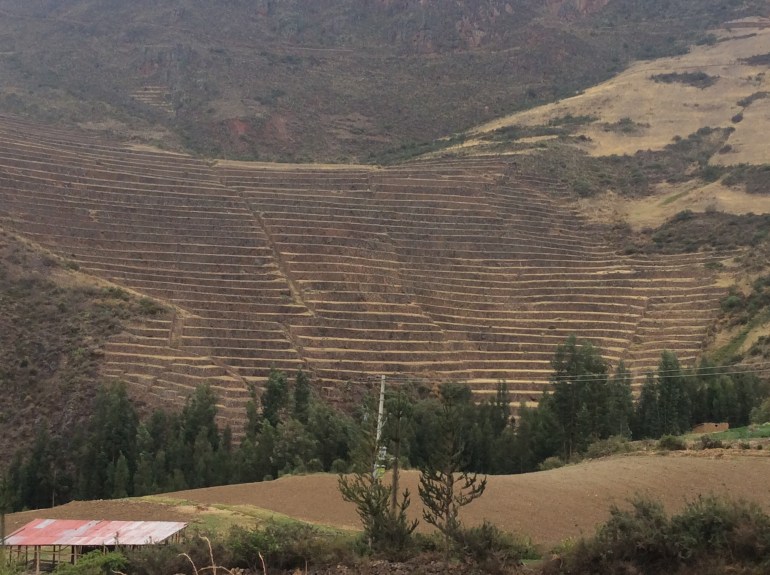 The road got narrower and narrower the higher we went. Everywhere we looked there was evidence of Inca farming. Looks like terraced steps.