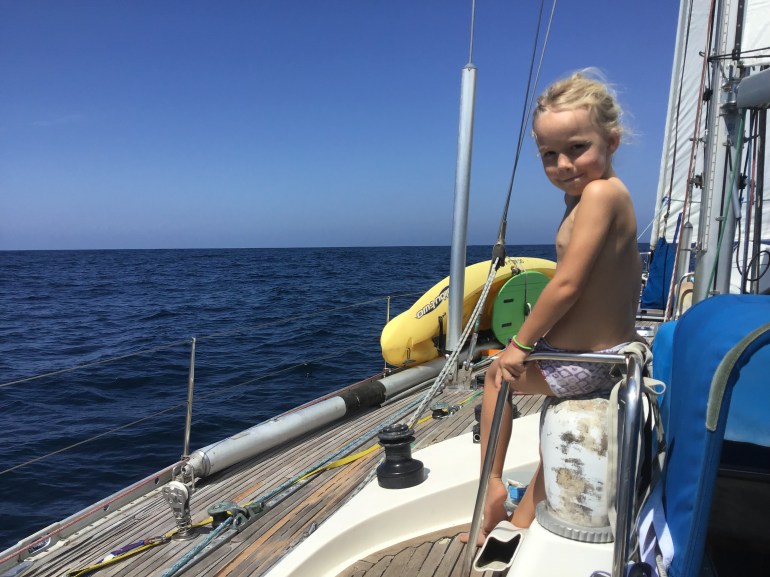 It was exhausting. The nights were so long and more and more often we would fall asleep, holding on to the helm and jerk awake when either your head fell to the side or your knees buckled under. A new rhythm appeared, sleep and helm, sleep and helm. Throw in the cooking and we had no more energy to even attempt school. The kids watched a lot of planet earth kind of movies and national geographic dvds which was given to me by Paula last summer in U.K. Could not have done without them!A better day. Sunny.