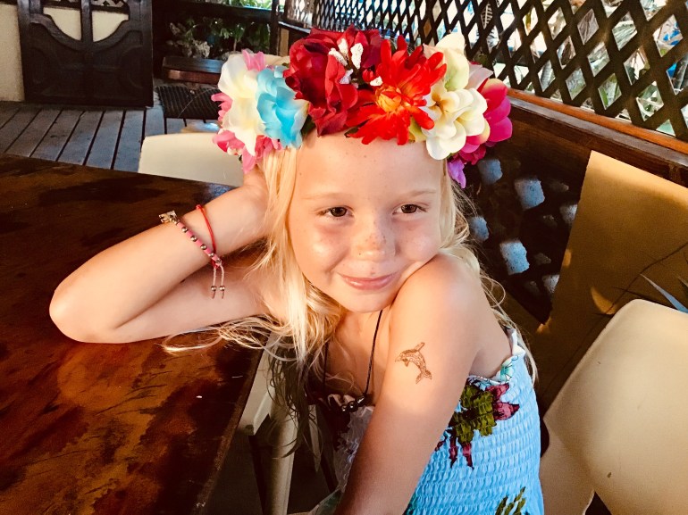 Before the trip we celebrated Alice’s birthday. The lucky girl got a black pearl necklace that James designed, sarong and flower tiara….