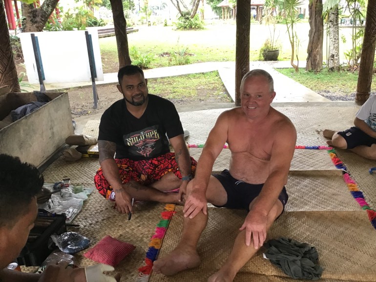 James was desperate for a tattoo and I said he could have one if it’s aloud. Usually you have to be 18 but in Samoa it’s …..wait for it……12 years. How lucky was he, legally made tattoo.
