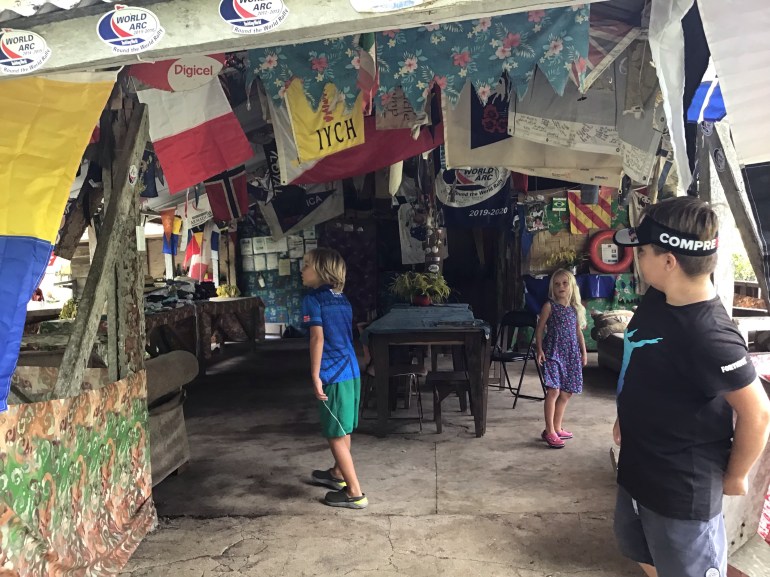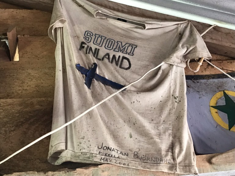 When I walked into the yacht club first time I had a good look around. Lots of different country flags, world arc flags and other messages thanking the locals for the hospitality. Then my eye caught the sight of a ragged and dirty white t shirt. As I looked closer I thought, wow, a Finnish flag marked on it. Then I read a name I recognised so well…..Jonatan Bjorndahl! I use to look after him as a baby in Finland and his mum was my teacher. I couldn’t believe my eyes. Of course I then remembered that he sailed across the Pacific a long time ago.