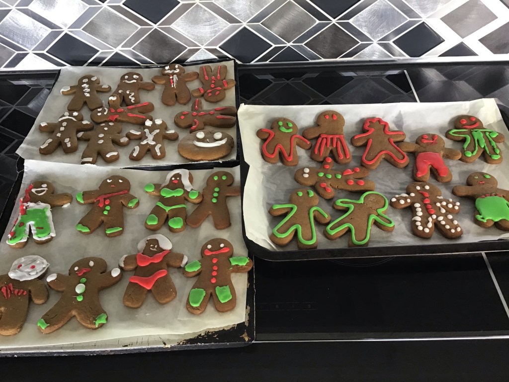 As I’m such a bad mum we have never made gingerbread biscuits. So this time I made the effort and got the kids to make them. They came out great although the decorations took a while to master…..