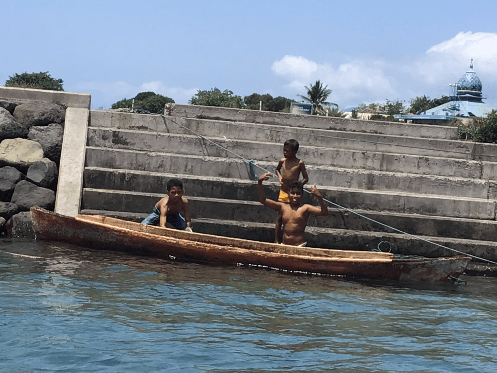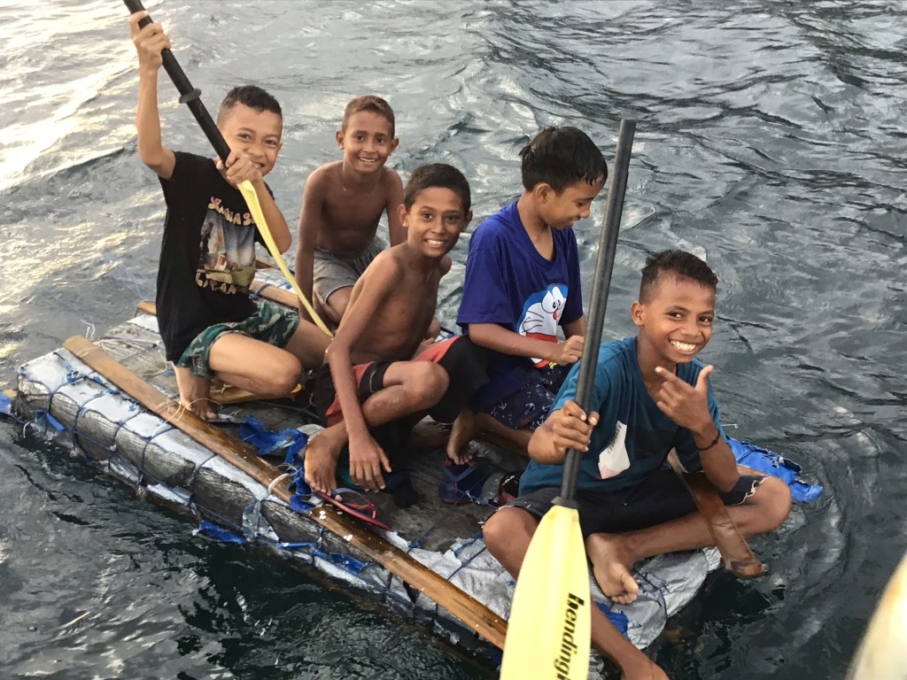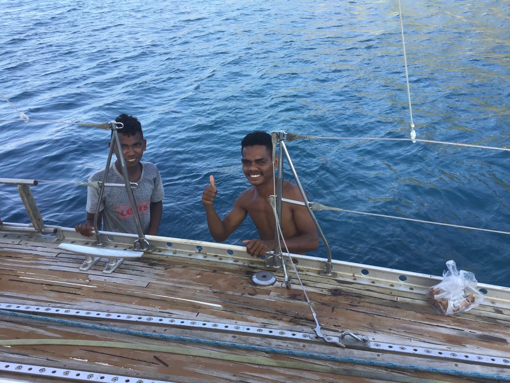 We had trouble anchoring in Larantuka. Very deep with poor holding so moved up the channel a bit and managed to anchor outside the residential houses. And soon enough we had kids and youngsters visiting us. Happy people indeed. These guys got a nice paddle from us.